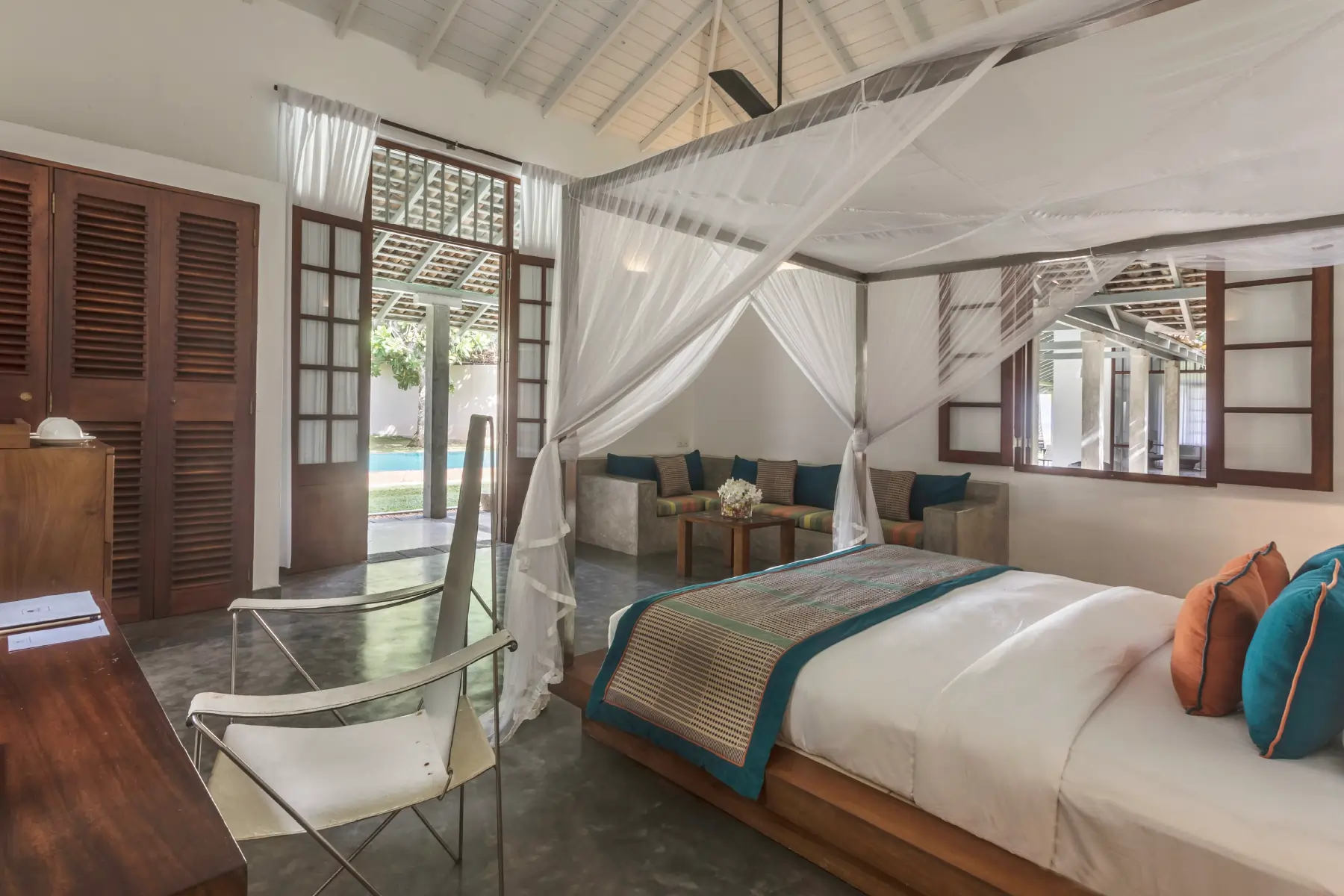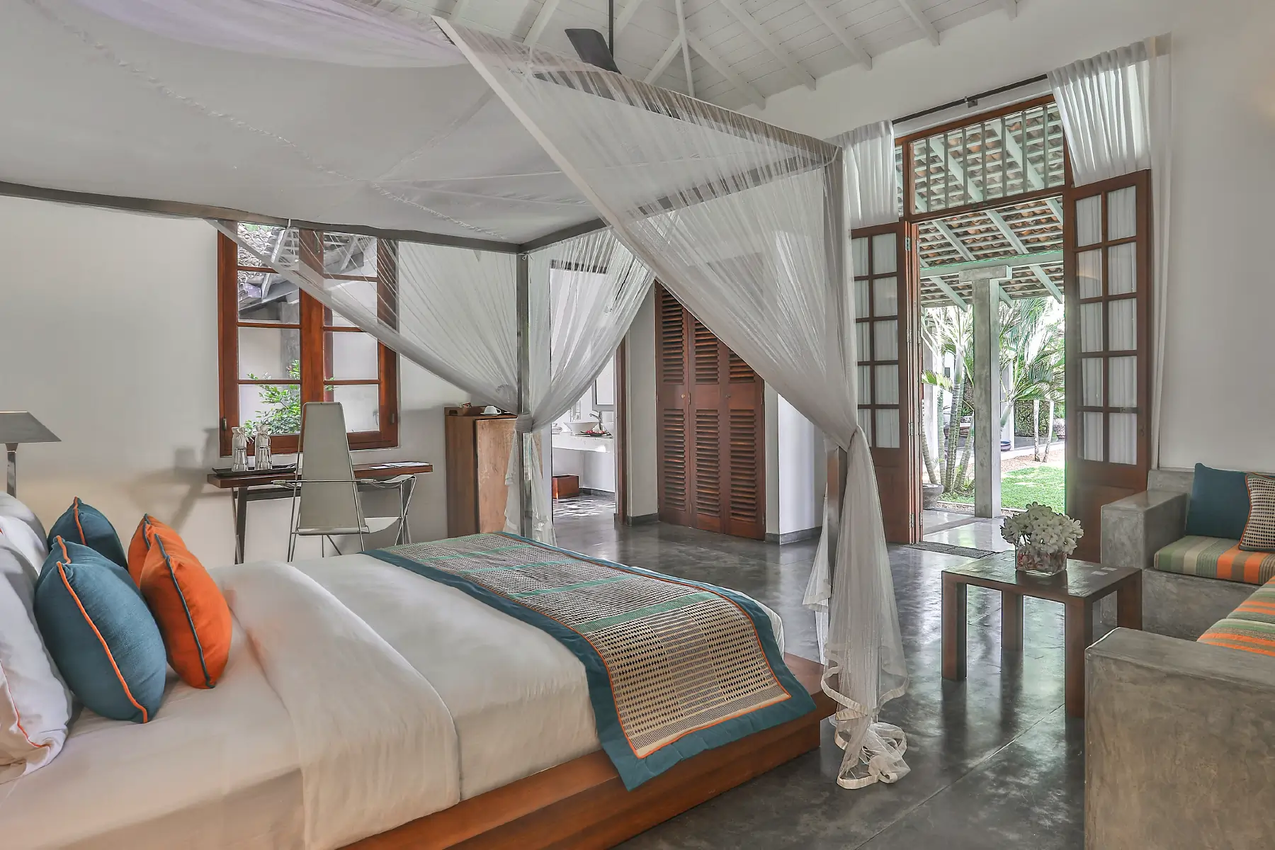 The suite is one of 5 in the Olive Ridley villa, which has two storeys and is located directly by the beach. There is plenty of indoor and outdoor living space with sofa beds, air-conditioning, ceiling fans, iPod station and iPod, high speed WiFi, a large elegant contemporary bathroom, private gardens with a bathtub, shower, hairdryer and designer bathroom amenities. The room features a four poster bed, a sofa-bed, an armchair and a desk with a Bawa designed leather chair. Exquisite linens and a choice of pillows are also available