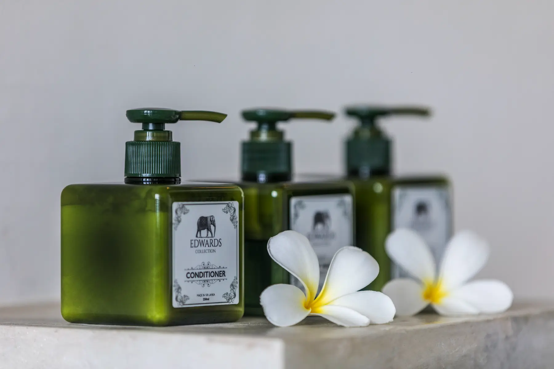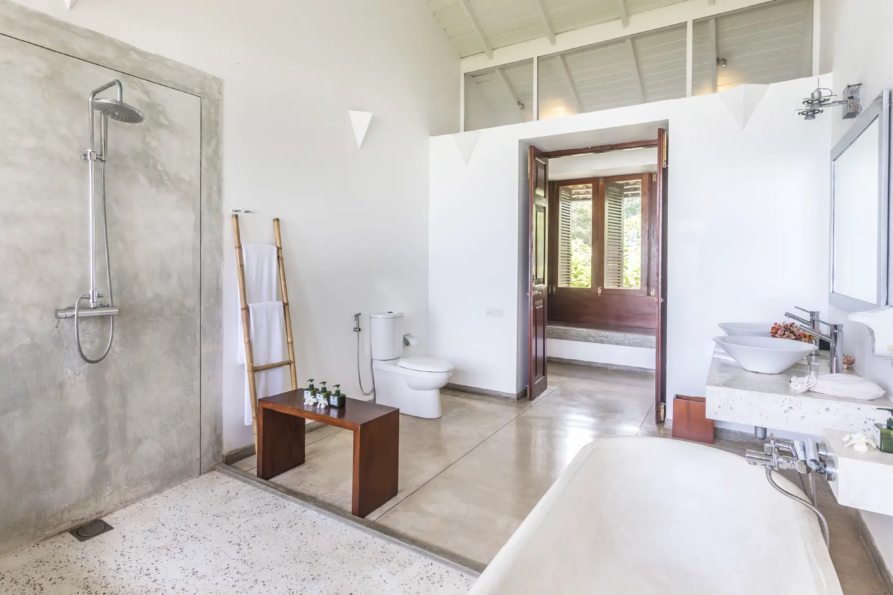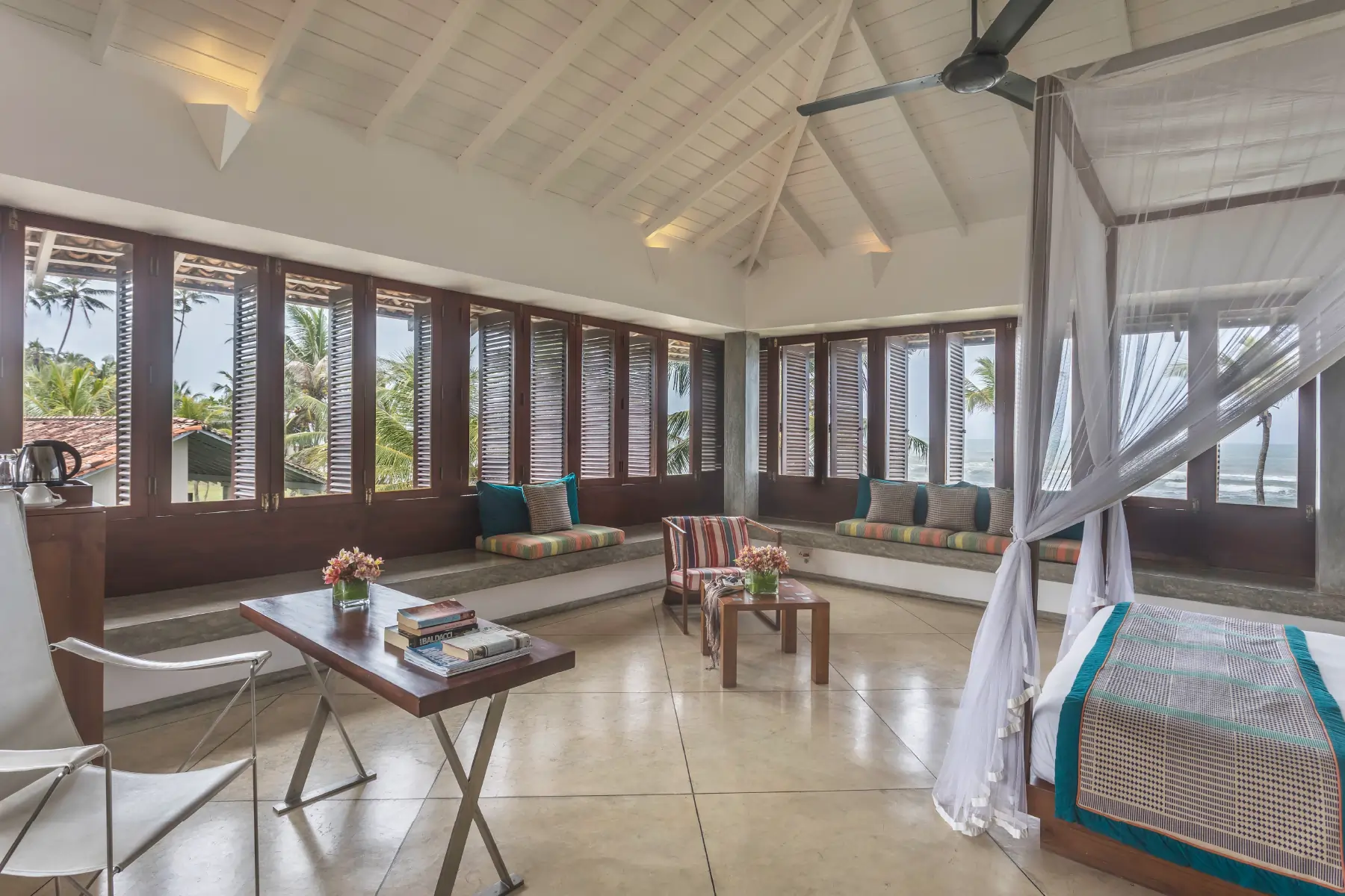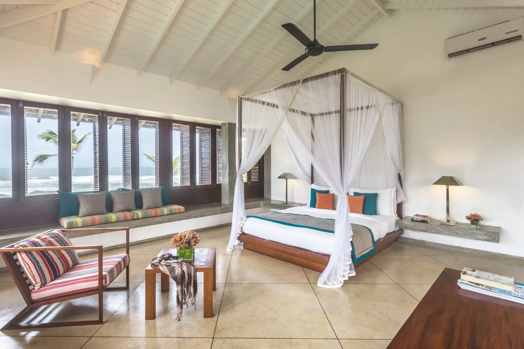 The suite is one of 5 in the Olive Ridley villa, which has two storeys and is located directly by the beach. There is plenty of indoor living space with sofa beds, air-conditioning, ceiling fans, bluetooth speakers, high speed WiFi, a large elegant contemporary bathroom with a bathtub, shower, hairdryer and designer bathroom amenities. The room features a four poster bed, a sofa-bed, an armchair and a desk with a Bawa designed leather chair. Exquisite linens and a choice of pillows are also available