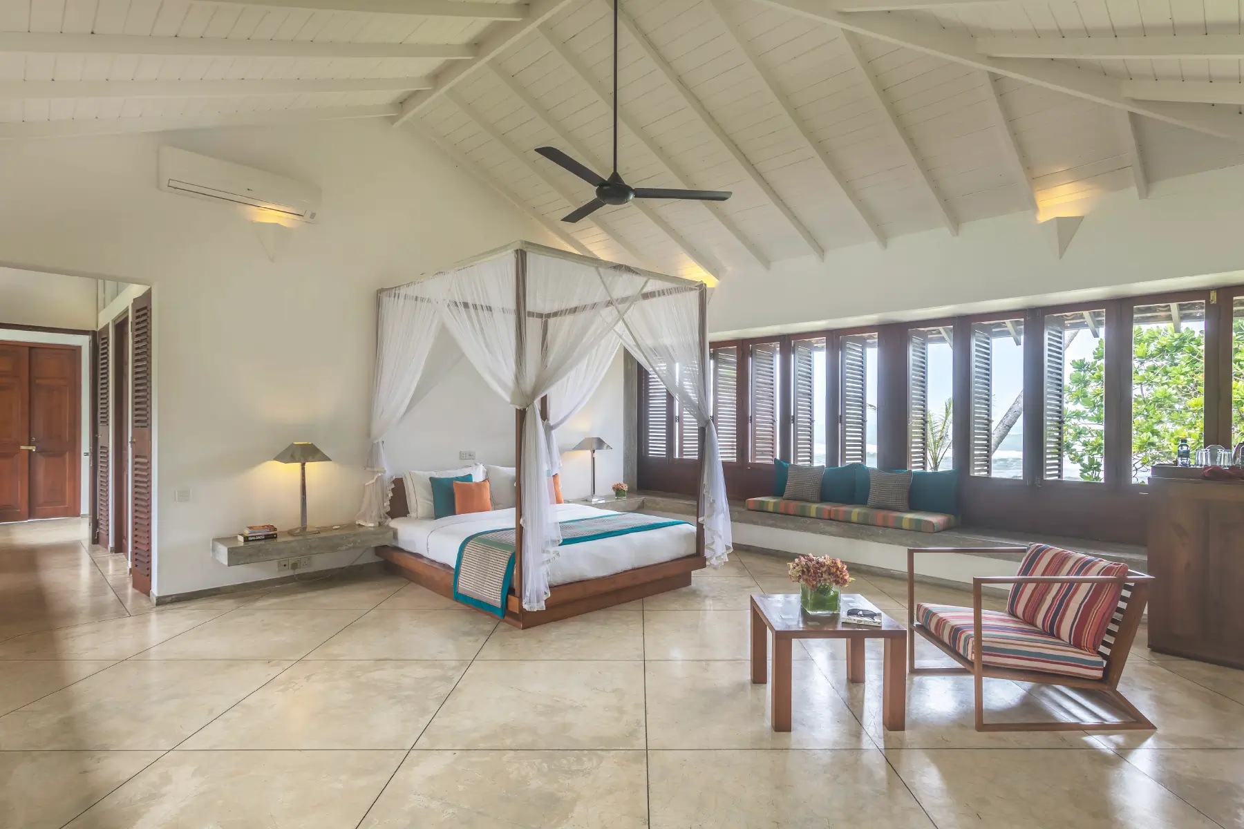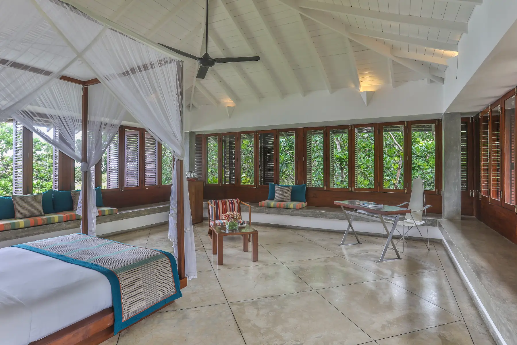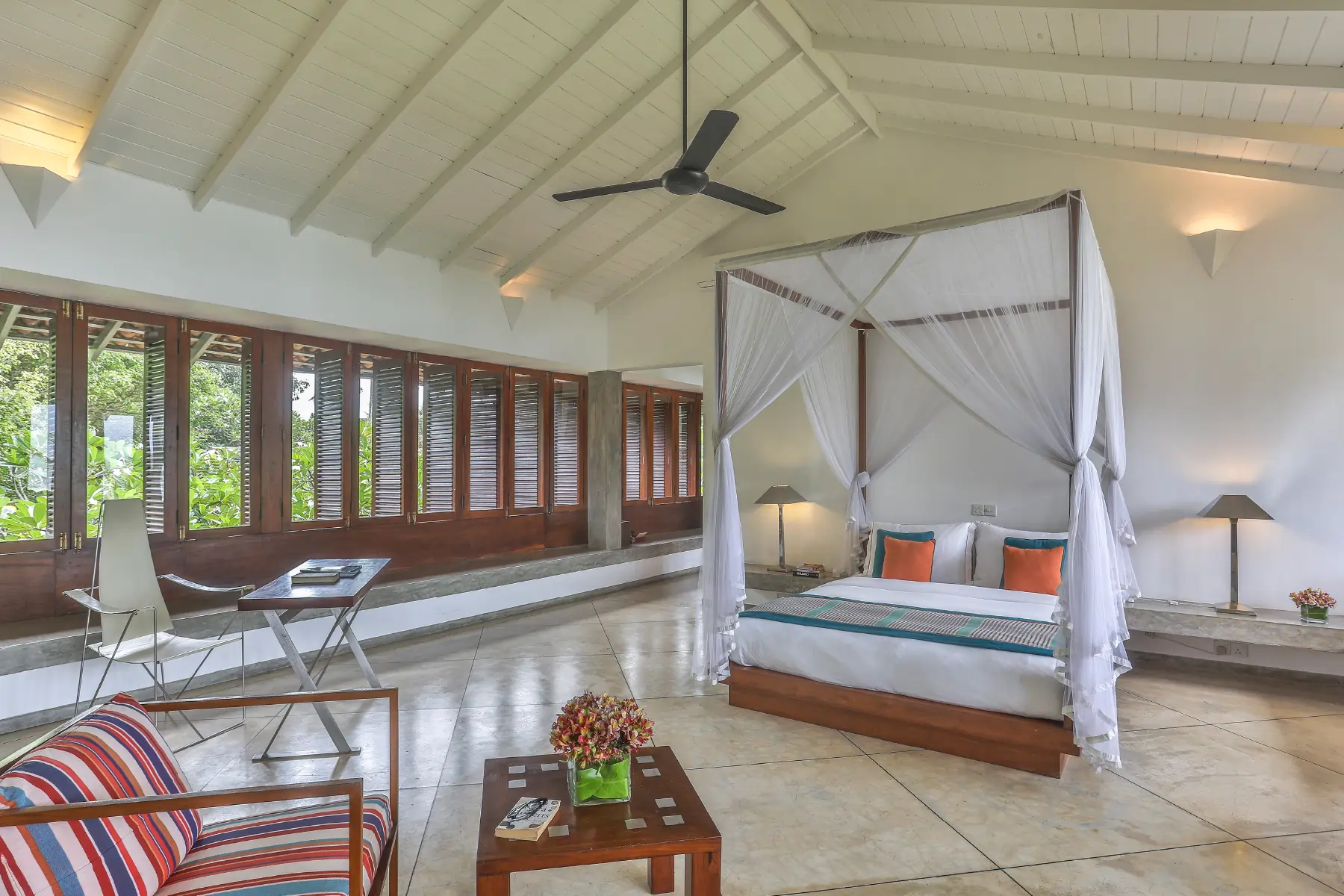 The suite is one of 5 in the Olive Ridley villa, which has two storeys and is located directly by the beach. There is plenty of indoor living space with sofa beds, air-conditioning, ceiling fans, Bluetooth speakers, high speed Wi-Fi, a large elegant contemporary bathroom with a bathtub, shower, hairdryer and designer bathroom amenities. The room features a four-poster bed, a sofa-bed, an armchair and a desk with a Bawa designed leather chair. Exquisite linens and a choice of pillows are also available
