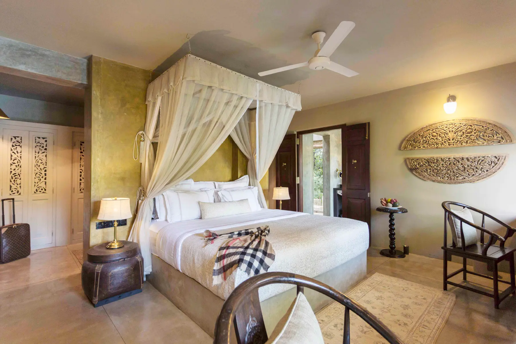 Vipassana meaning an insight into the true nature of reality, is a beautiful suite which transports guests into a world of unreality. Vipassana’s immediate neighbours are a family of wild parrots that live in a tree just outside the room. It has a large bedroom, a Dressing room and en-suite bathroom. Vipassana also has its own ‘Antique Library’ with extremely rare ancient coins and works of art made with Ivory used by kandyan royalty more than a century ago. It offers amazing views of the lake as well as the forest. The en-suite bathroom complete with two showers, one out door and one indoor and outsized bath, is decorated with genuine antique pieces and offers an amazing view of the Lake as well as the forest.