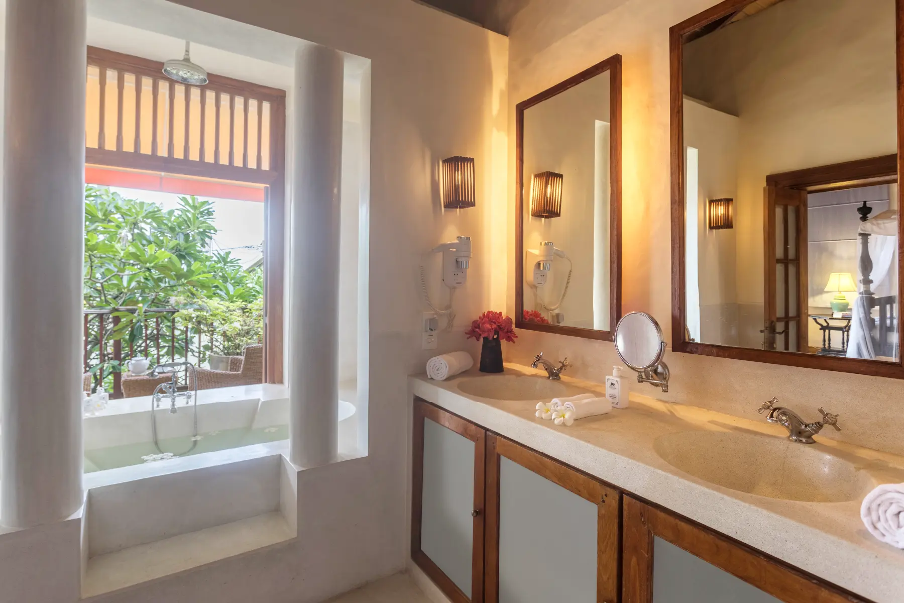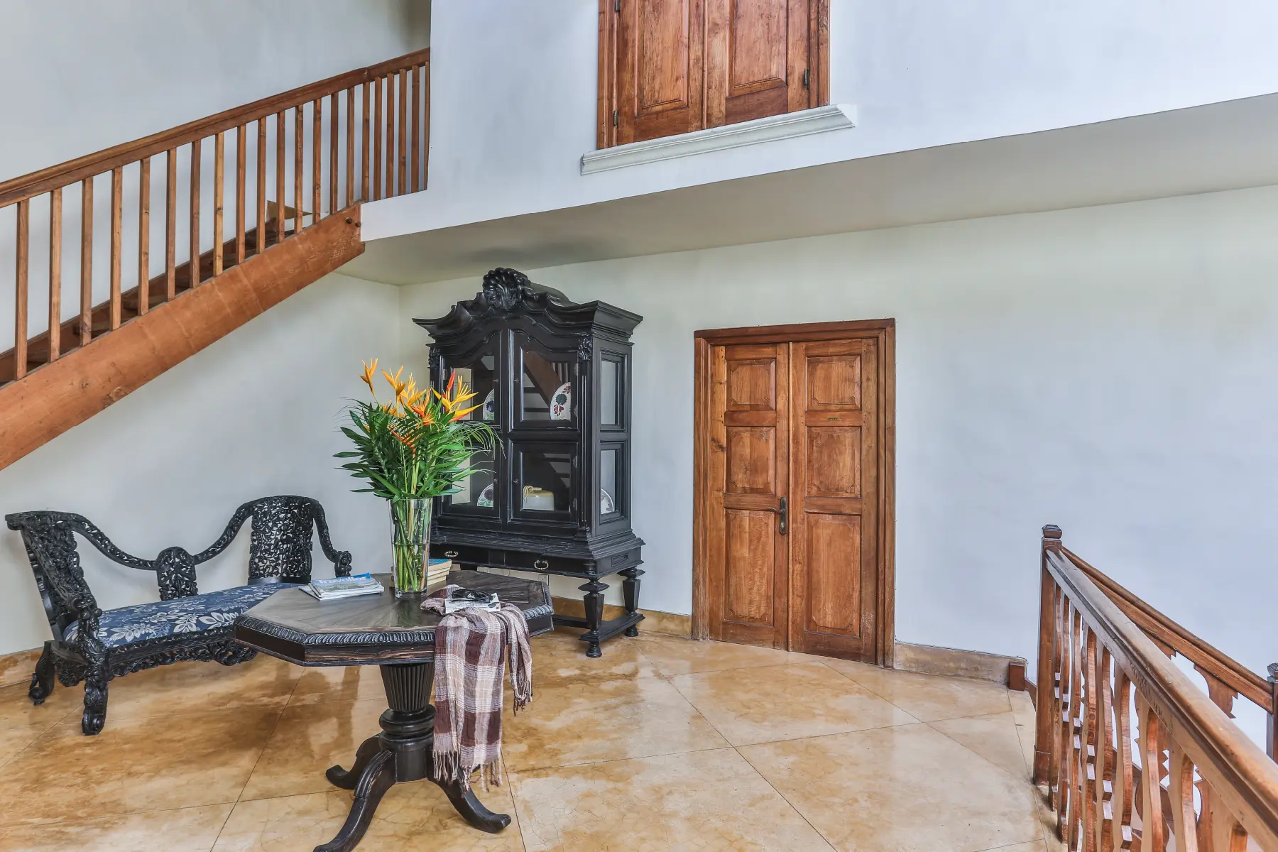 The Master Bedroom is situated on the first floor and has large French windows and a Private Terrace that provides rare uninterrupted sea views and beautiful sunsets. Interiors are tastefully decorated with 16th, 17th and 18th Century Genuine Antique Ebony and Calamander Furniture and contemporary local art. The spacious bathroom has been decorated with miniature Roman pillars reminiscent of the days when seafarers of different nationalities worked and lived in the Fort for a while and then moved on leaving their foot print behind.