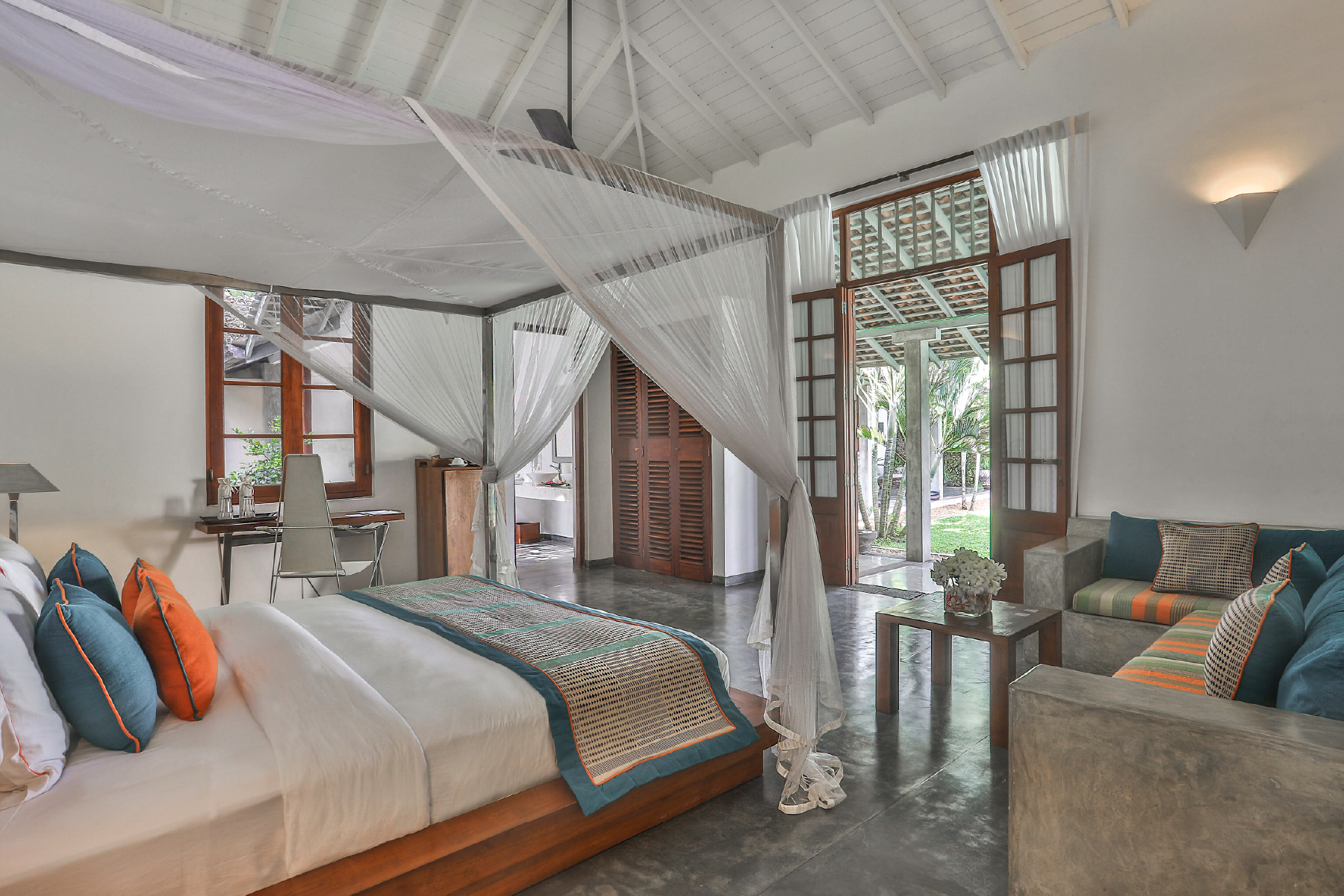 The suite is one of 5 in the Olive Ridley villa, which has two storeys and is located directly by the beach. There is plenty of indoor and outdoor living space with sofa beds, air-conditioning, ceiling fans, iPod station and iPod, high speed WiFi, a large elegant contemporary bathroom, private gardens with a bathtub, shower, hairdryer and designer bathroom amenities. The room features a four poster bed, a sofa-bed, an armchair and a desk with a Bawa designed leather chair. Exquisite linens and a choice of pillows are also available