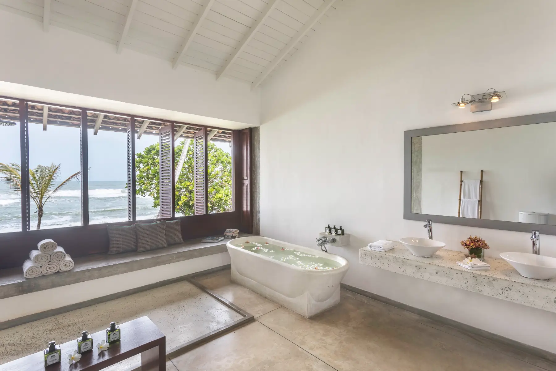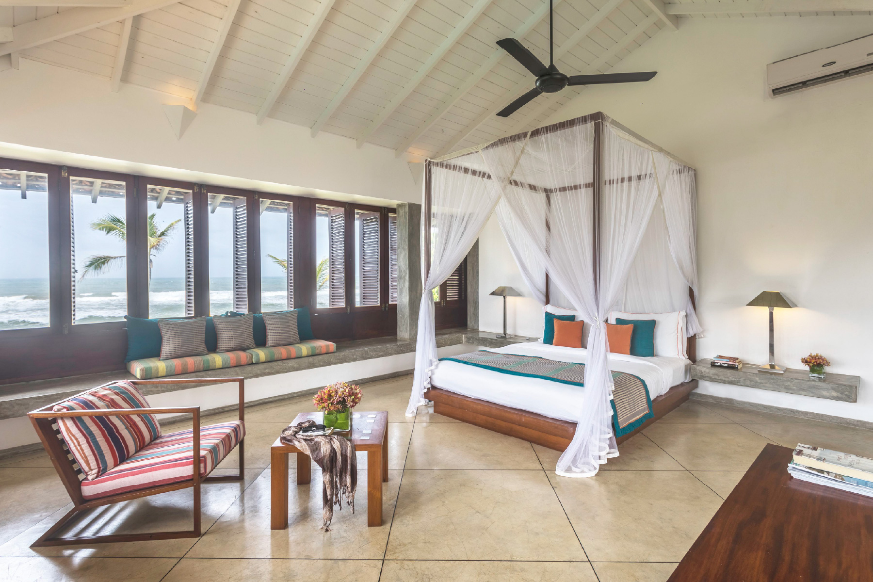 The suite is one of 5 in the Olive Ridley villa, which has two storeys and is located directly by the beach. There is plenty of indoor living space with sofa beds, air-conditioning, ceiling fans, bluetooth speakers, high speed WiFi, a large elegant contemporary bathroom with a bathtub, shower, hairdryer and designer bathroom amenities. The room features a four poster bed, a sofa-bed, an armchair and a desk with a Bawa designed leather chair. Exquisite linens and a choice of pillows are also available