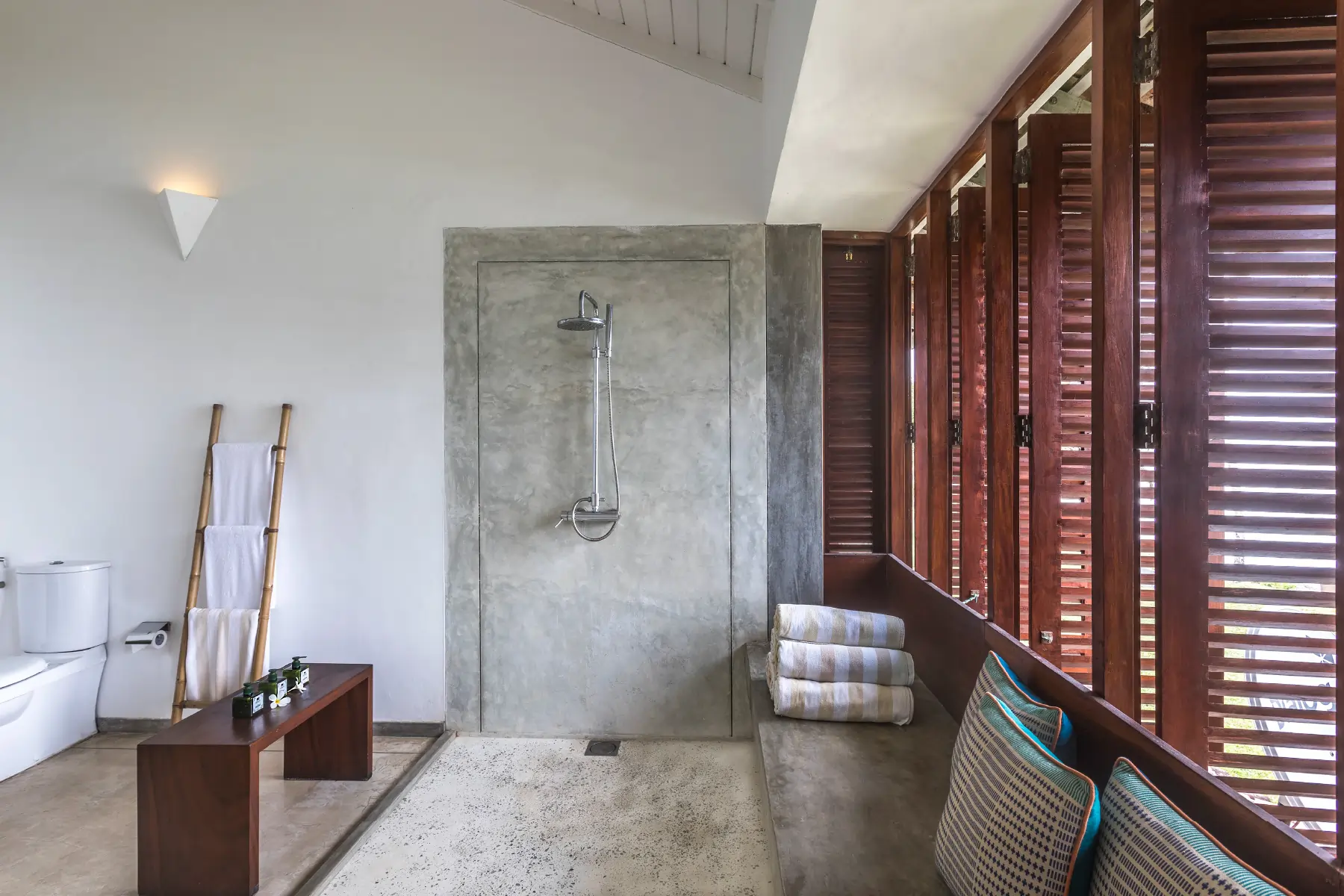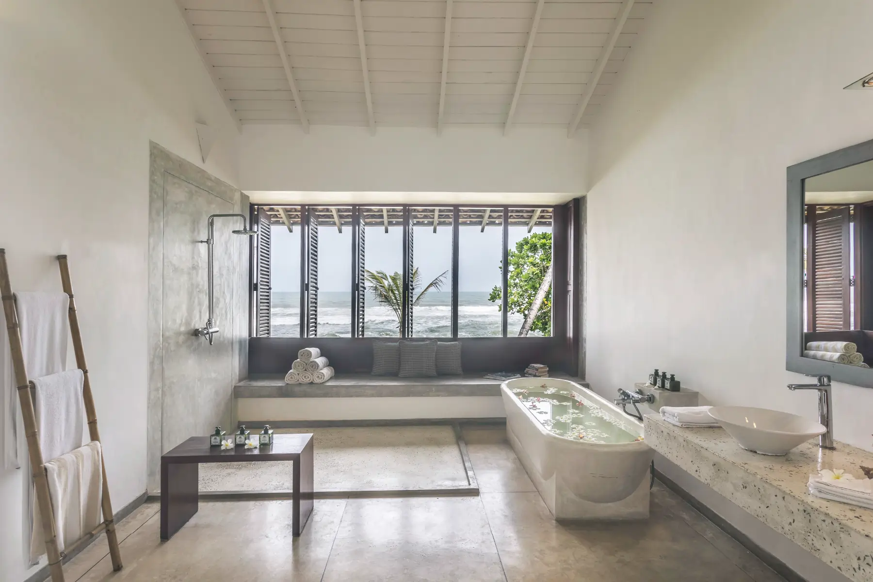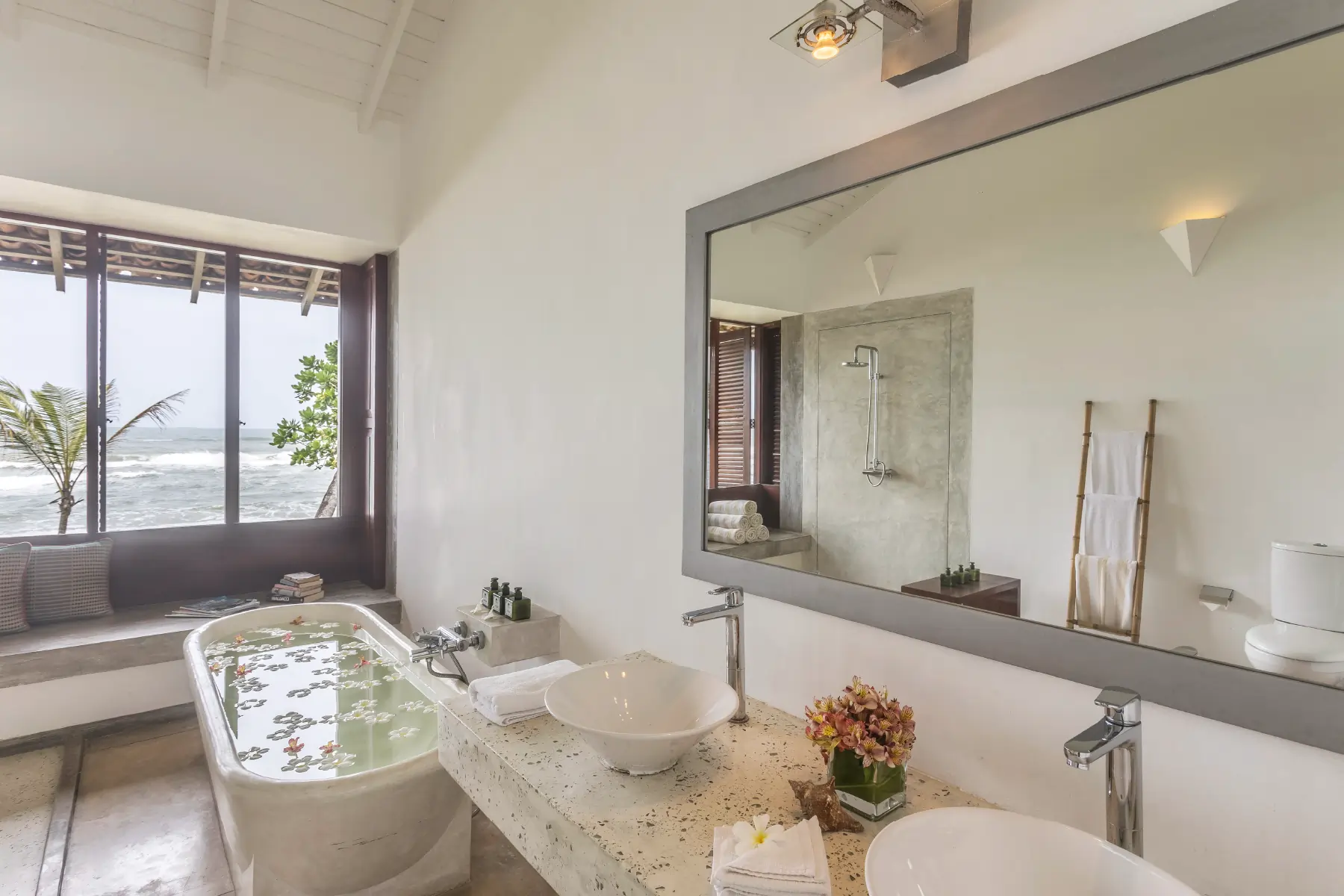 The suite is one of 5 in the Olive Ridley villa, which has two storeys and is located directly by the beach. There is plenty of indoor living space with sofa beds, air-conditioning, ceiling fans, Bluetooth speakers, high speed Wi-Fi, a large elegant contemporary bathroom with a bathtub, shower, hairdryer and designer bathroom amenities. The room features a four-poster bed, a sofa-bed, an armchair and a desk with a Bawa designed leather chair. Exquisite linens and a choice of pillows are also available