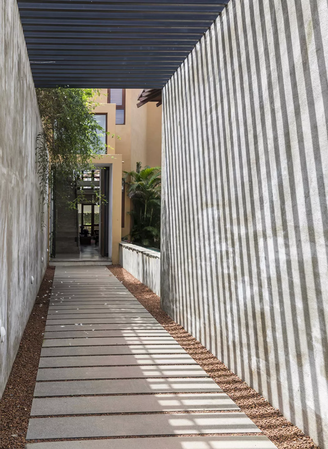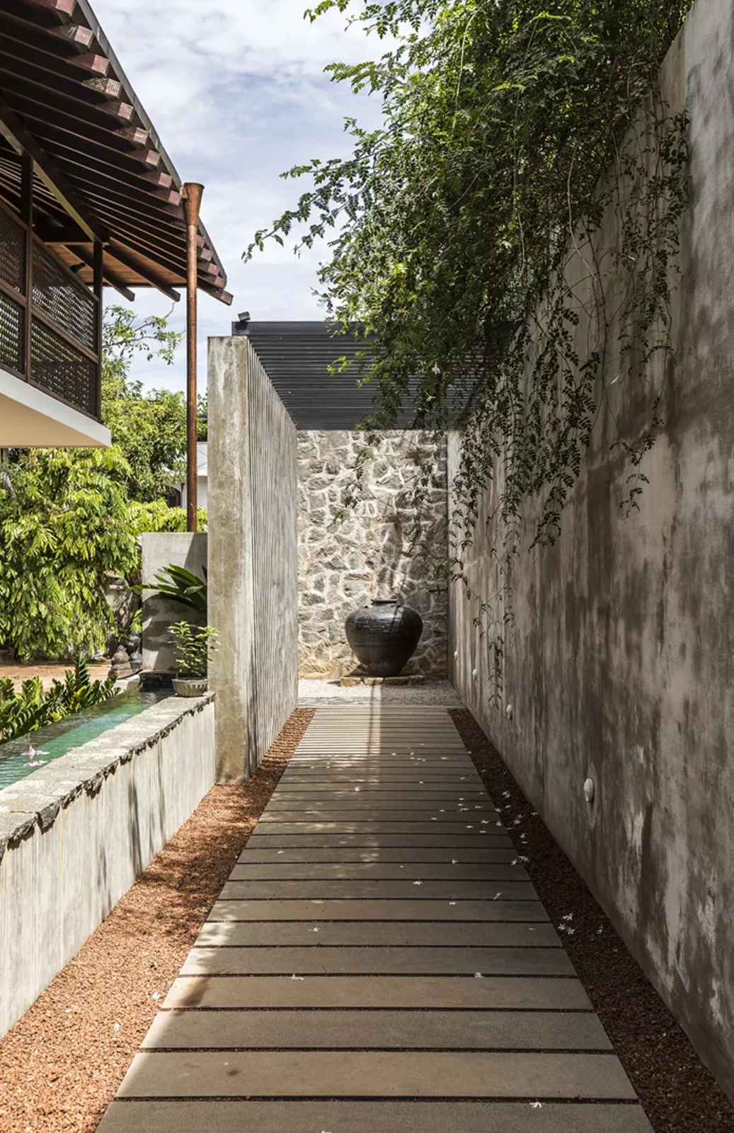 At the beginning of the 1960s Bawa had built a simple pavilion house for Pin and Pam Fernando on a fairly small plot in a short cul¬de-sac off Kannangara Mawatha. Bawa had been experimenting with tower houses ever since completing the house for Peter Keuneman and had recently added a tower to his own house in 33rd Lane. He tucked the new house into a corner of the Fernando's' garden and let it grow up between the branches of a tall bo tree. Visitors arrive at a porch at the end of the cul-de-sac and are led via a long top-lit tunnel to the base of the tower. Kitchen and dining room are on the ground floor, the sitting room is on the first floor, the bedroom is on the second floor and the top floor is given over to a roof terrace. Offering an alternative prototype for the tropical urban house, The Tower by Bawa is spatially innovative and an example of a new 'stripped-down' aesthetic that would reappear in Bawa's work with increasing frequency.