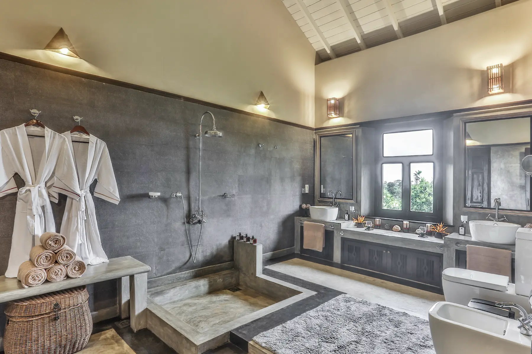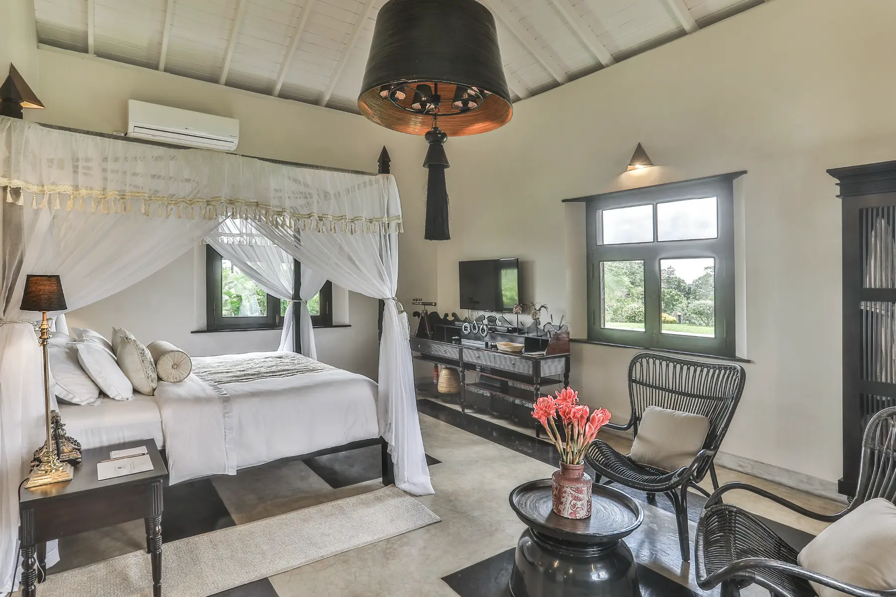 King size four-poster bed, Bose sound system with iPod stand, flat screen TV, telephone, internet access, AC, mosquito net, mirrored glass windows (you can see outside, but nobody can see in), en-suite luxury bathroom.