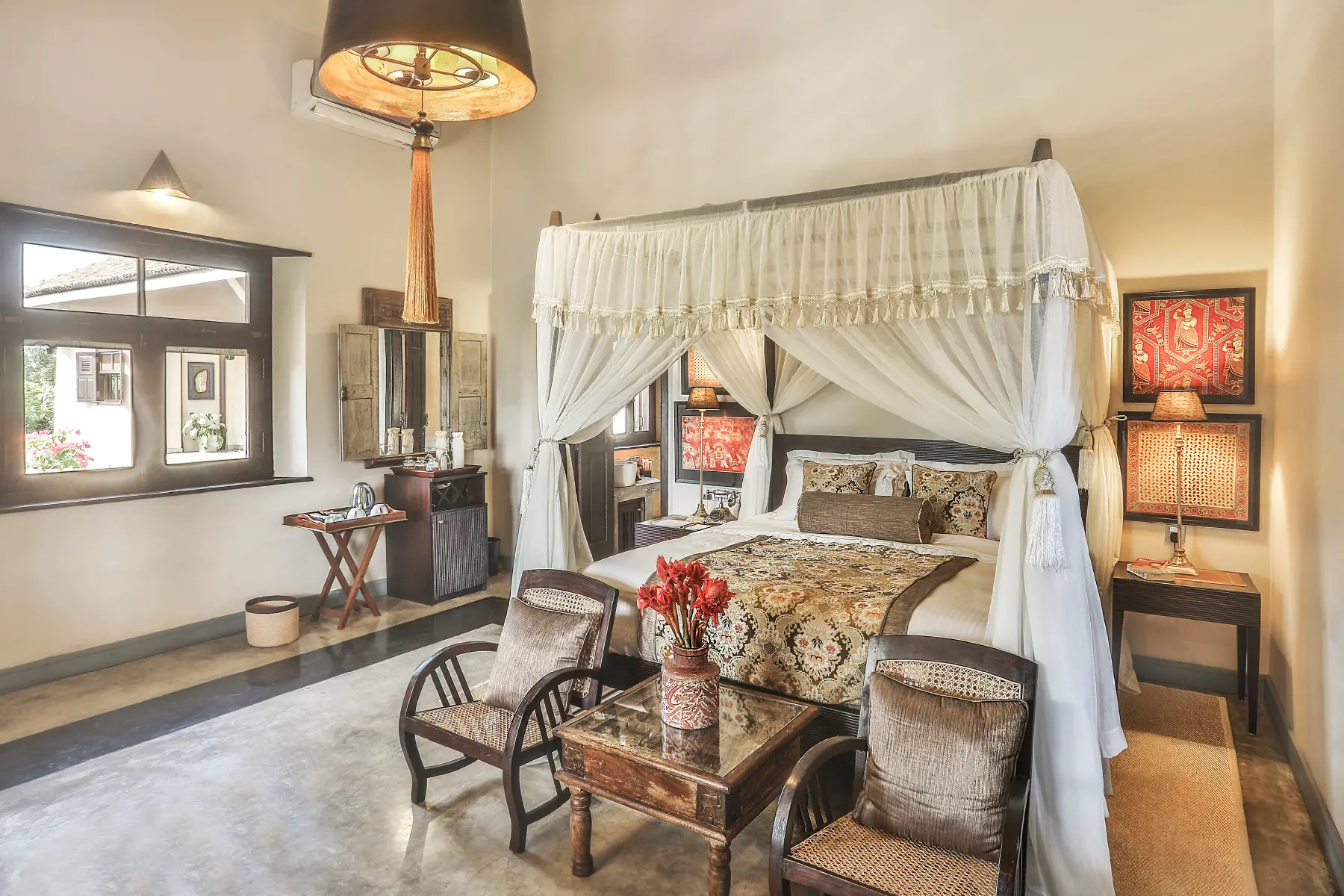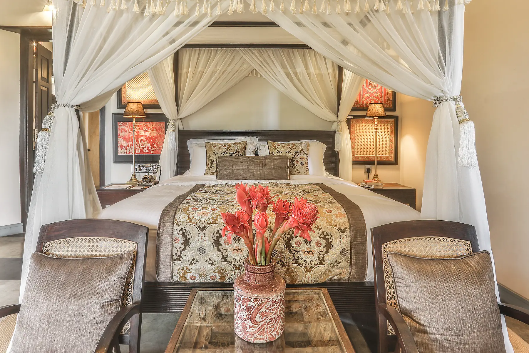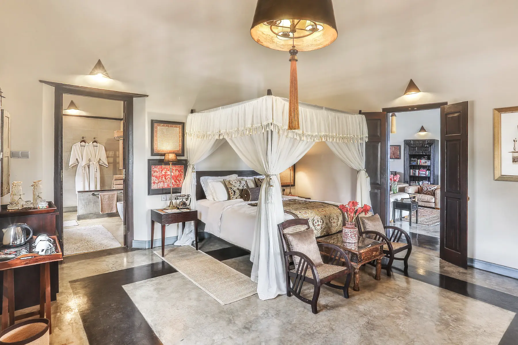 The Yellow Suite includes an open pantry (tea kitchen with direct access to the main lounge), king size four-poster bed, Bose sound system with iPod stand, flat screen TV, telephone, internet access, AC, mosquito net, mirrored glass windows (you can see outside, but nobody can see in), en-suite luxury bathroom.